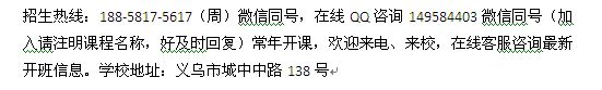 招生热线:188-5817-5617(周)微信同号,在线QQ咨询149584403微信同号(加入请注明课程名称,好及时回复)常年开课,欢迎来电、来校,在线客服咨询最新开班信息。学校地址:义乌市城中中路138号